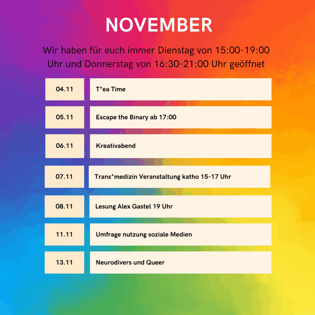 Am 07.11. organisiert der AK Queer in der katho eine Veranstaltung zu trans* Medizin, zwischen 15 und 17 Uhr. Am 08.11. um 19:00 Uhr findet eine Lesung statt im Rainbowzentrum, wo auch die Jugendlichen eingeladen sind.